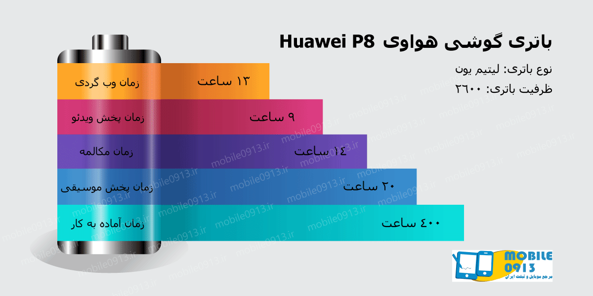 -در حالت کلی،هواوی پی8 توانسته رضایت کاربران را جلب کند.اگر در روز یک ساعت به مکالمه،یک ساعت به پخش ویدئو،یک ساعت به وبگردی بپردازیم و در دیگر ساعات موبایل را در حالت استندبای قرار دهیم توانایی پایداری باتری به مدت 400ساعت خواهد بود که زمان قابل توجهی است.
